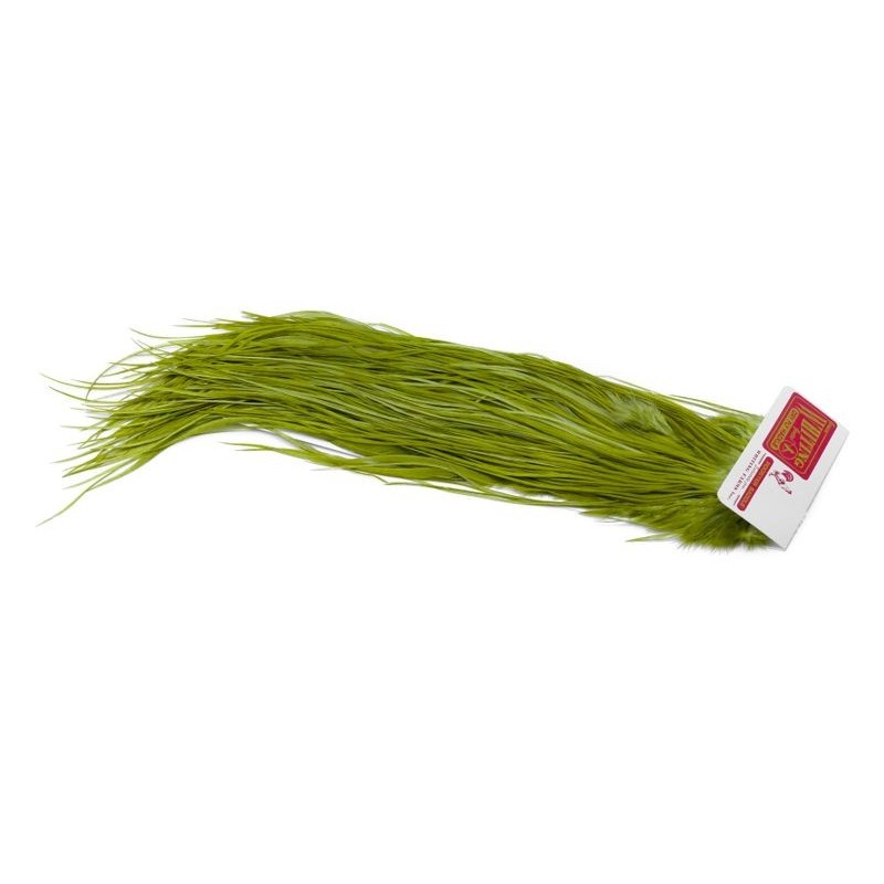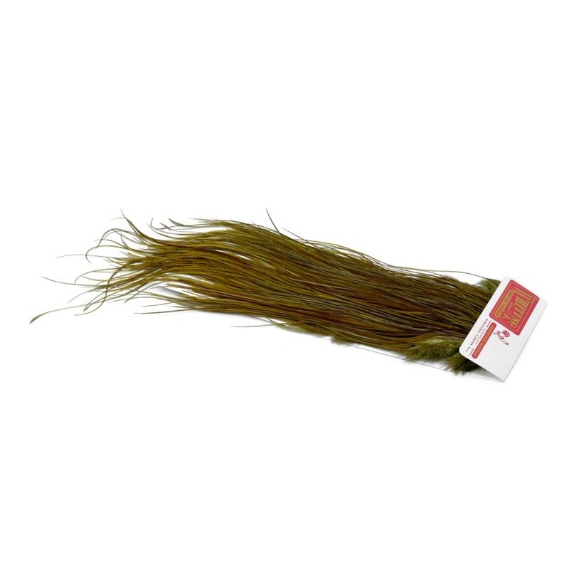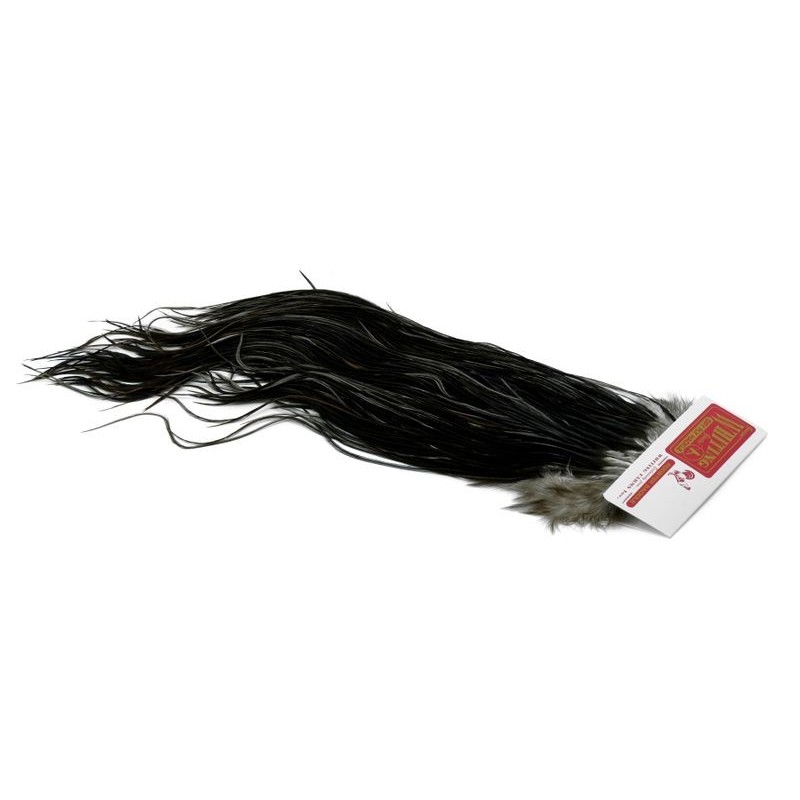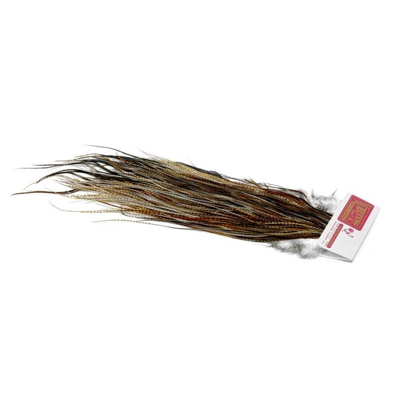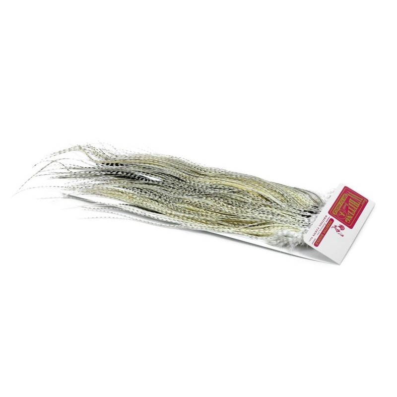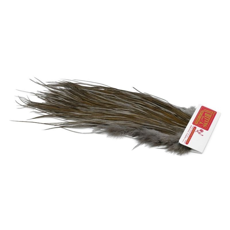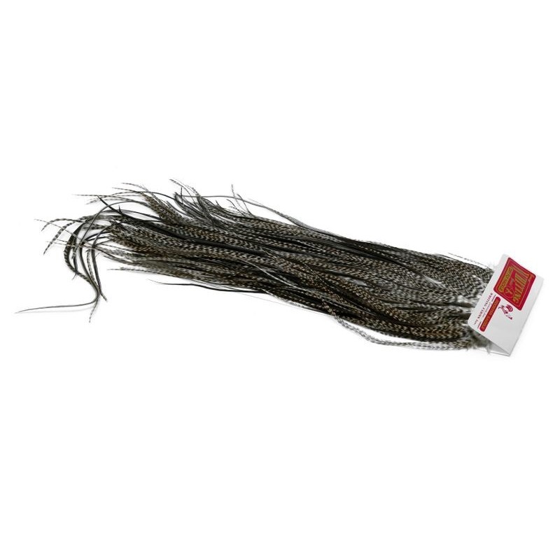 La montura comercial de Whiting Farms forma parte de la gama Pro Grade de Whiting Farms, desarrollada para ofrecer un excelente rendimiento en el montaje. Cada montura proporciona un gran volumen de plumas largas y manejables, lo que permite atar varios cientos de moscas secas. Los tamaños de hackle se sitúan principalmente entre 14 y 18, cubriendo los usos comunes en la pesca de la trucha. En el vicio, las plumas tienen una longitud constante y una densidad adaptada al atado repetido, lo que facilita el trabajo en serie. Esta gama se elige cuando el objetivo es producir eficazmente moscas funcionales, sin buscar los grados superiores destinados a los montajes de presentación.